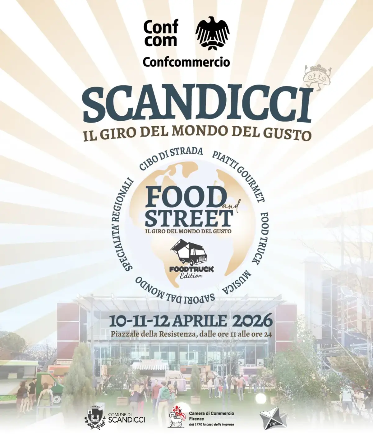 Dal 10 al 12 aprile 2026, Scandicci ospita il festival dello street food con cucine internazionali, food truck e specialità gourmet in Piazzale della Resistenza.